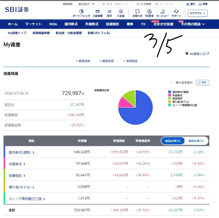 【2026年3月5日】ポートフォリオ現状分析:波乱の日本株と、それを支える米国株・仮想通貨の底力