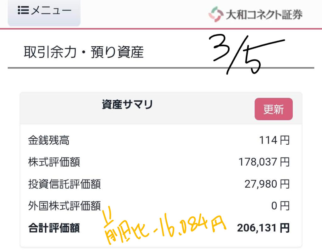 • 合計評価額: 前日比 ⬇️ -16,084円