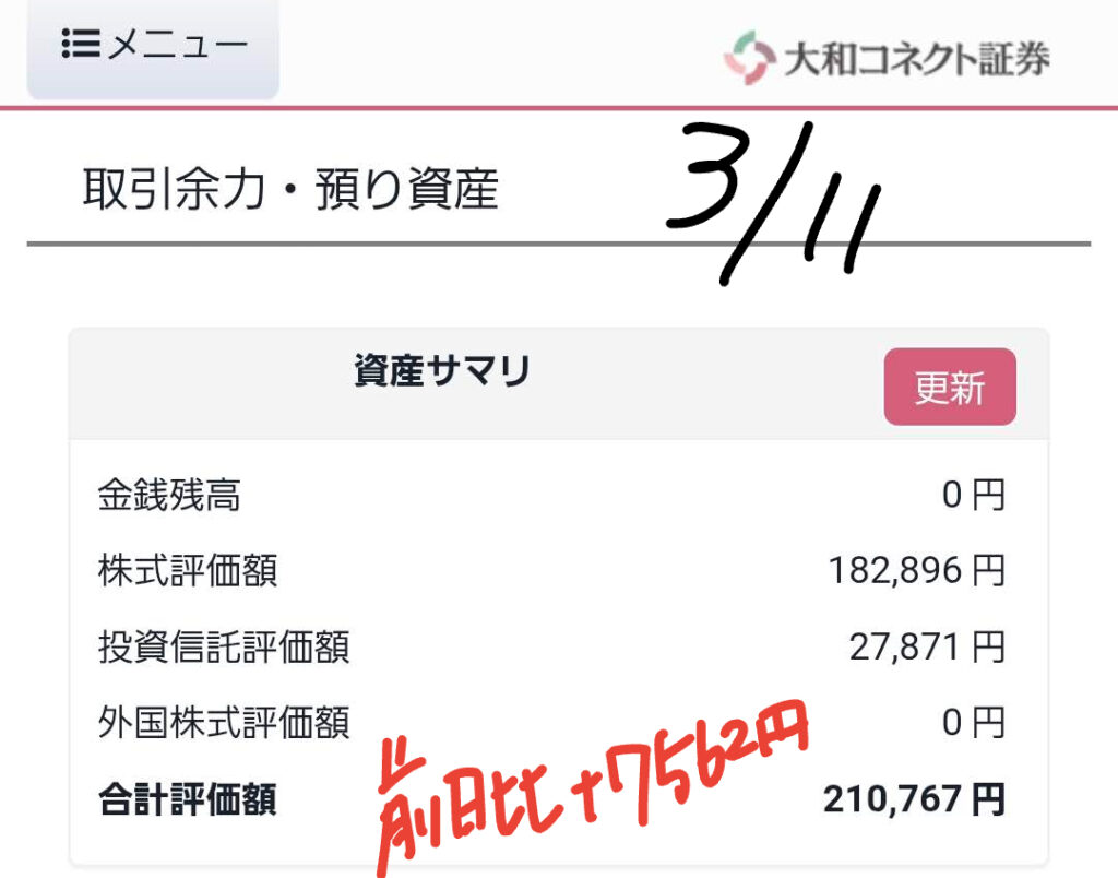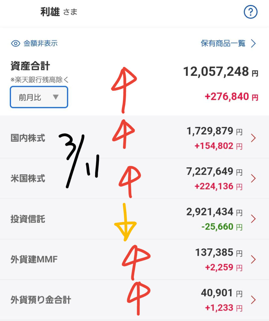主力口座は微減となりました。トランプ氏が「今は戦争優先」というスタンスを示したことで、米国株市場には一時的な緊張感が走り、私の保有するインデックスや米国個別株にもわずかな調整が入っています。