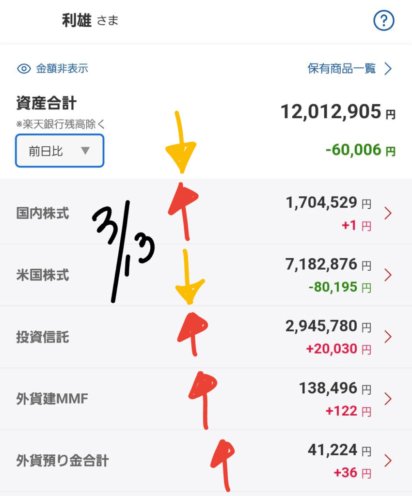 全体としては、米国株の下落が大きく響き、資産合計は前日比で ⬇️ となっています。