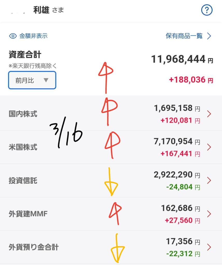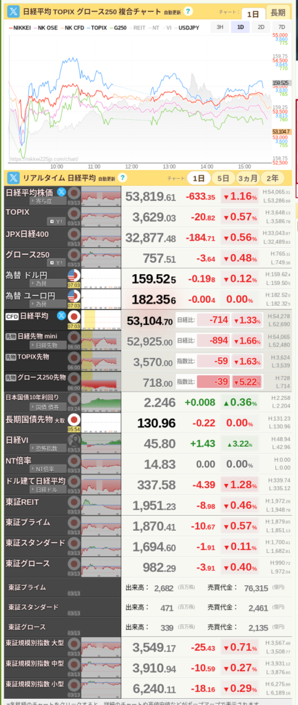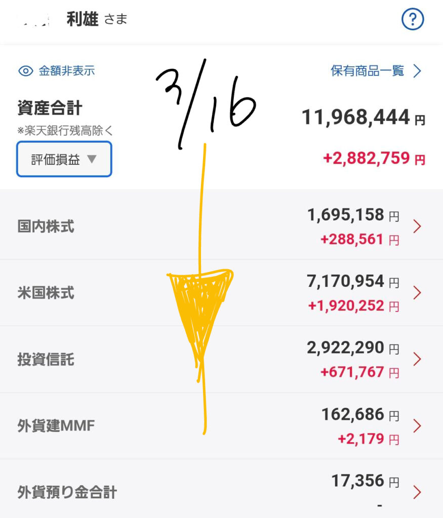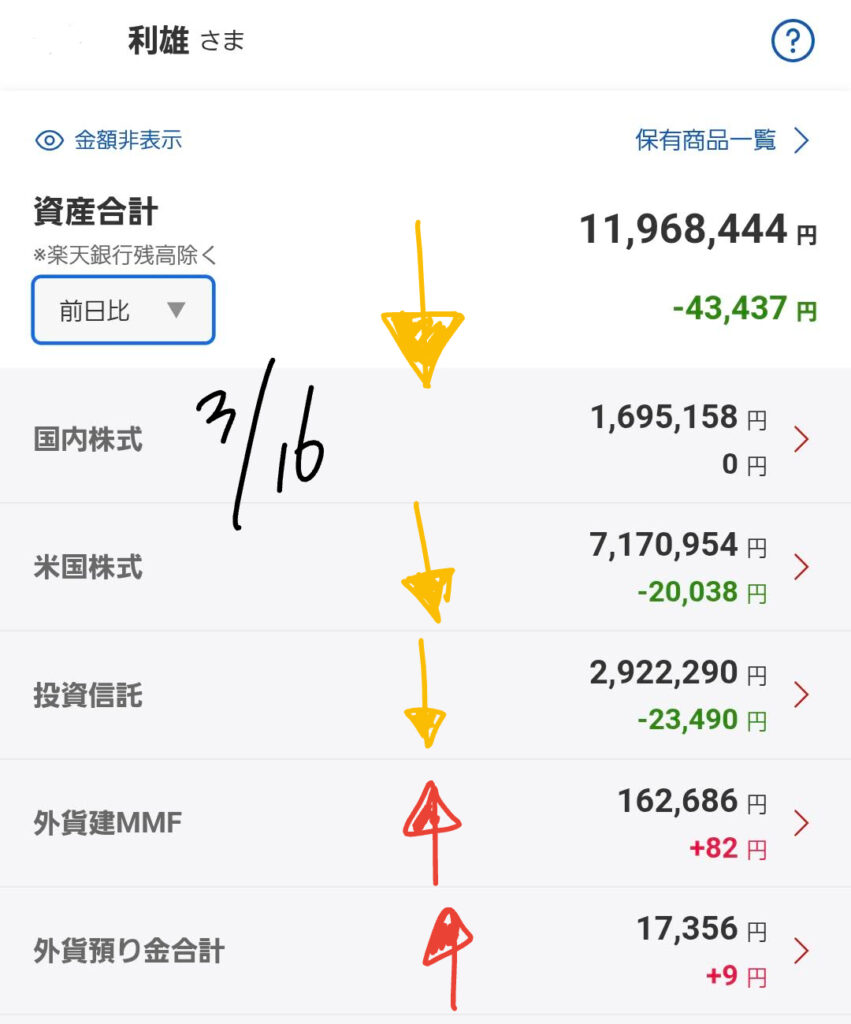本日は2026年3月16日。週明けの市場は、地政学リスクの長期化を懸念し、非常に神経質な動きを見せています。私の各証券口座(楽天・SBI・大和コネクト)の最新データをもとに、現在のリアルな状況をお伝えします。