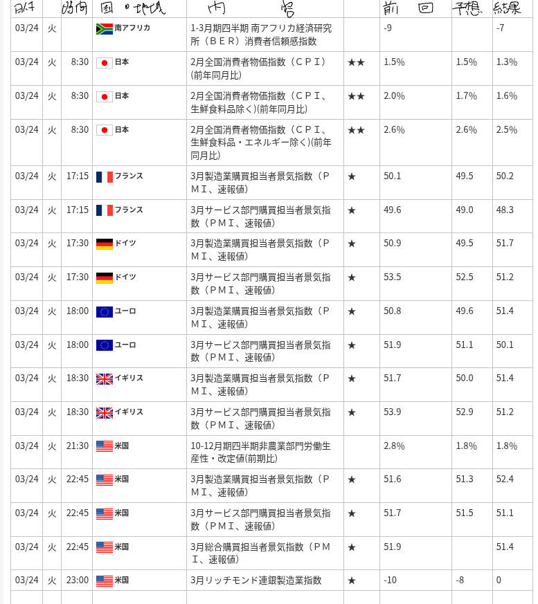 3月24日発表の指標は、**「製造業の復調」と「サービス業の微減速」**が世界的な共通トレンドとして現れました。 特に米国とイギリスで製造業PMIが改善したことは、実体経済の底堅さを裏付けています。また、日本のCPIが2%を超えて推移していることは、デフレ脱却の確信を強める材料となります。インドの圧倒的な成長スピードを含め、世界経済は全体として「緩やかな拡大」の中にあると言えますが、今後は物価上昇が続く中での各国の利下げ判断が焦点です。